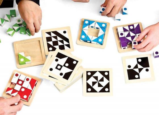 Three different types of visual challenges make Q-bitz the perfect game for multiple playing styles. Round One is all about speed as players race to manipulate their cubes to copy the pattern on the Q-bitz card. The first player to complete the pattern keeps the card. Round Two adds luck to the equation, as players roll their cubes to match the pattern. Round Three really tests brain power, as players must re-create the pattern from memory. Collect the most cards and win!